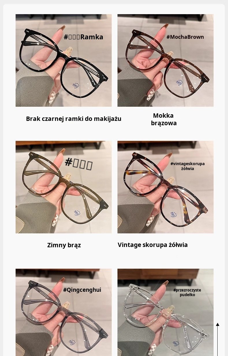 Damskie okulary w czarnych oprawkach, antyniebieskie, jasne, duże, płaskie okulary z ramkami w stylu